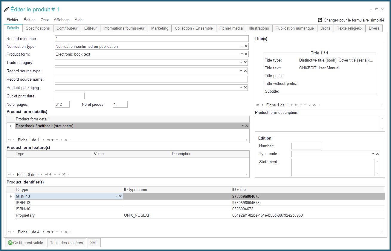 ONIXEDIT est doté d'une interface moderne et conviviale. Vous n'avez pas besoin de connaitre le XML ni la norme ONIX pour vous en servir. Il vous suffit de vous concentrer sur ce qu'il y a de plus important pour vous: vos métadonnées.