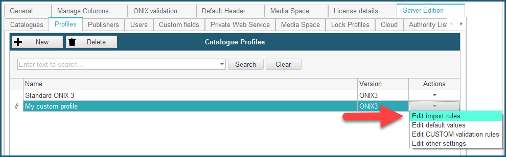 1 a - To set default values for an unassigned catalogue: From the Preferences module, go to the Server Edition / Catalogues tab and select Edit default values in the action menu corresponding to the catalogue you want to modify: