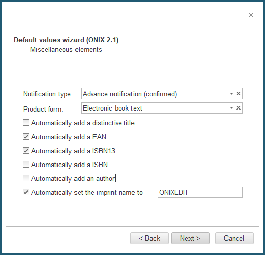 You can set default values for any ONIX field that will apply when a new title will be added to a catalogue using ONIXEDIT Pro or ONIXEDIT Cloud.