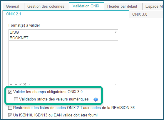 Pour de meilleurs résultats, assurez-vous de valider votre fichier ONIX 2.1 avec l'option "Valider les champs obligatoires ONIX 3.0" activée dans vos préférences ONIXEDIT avant de le convertir en ONIX 3.0. Vous pouvez également activer la fonction "Validation stricte des valeurs numériques" pour vous assurer que les valeurs numériques sont valides (pas de quantité négative, par exemple). Toutes les erreurs de validations doivent être corrigées avant la conversion.